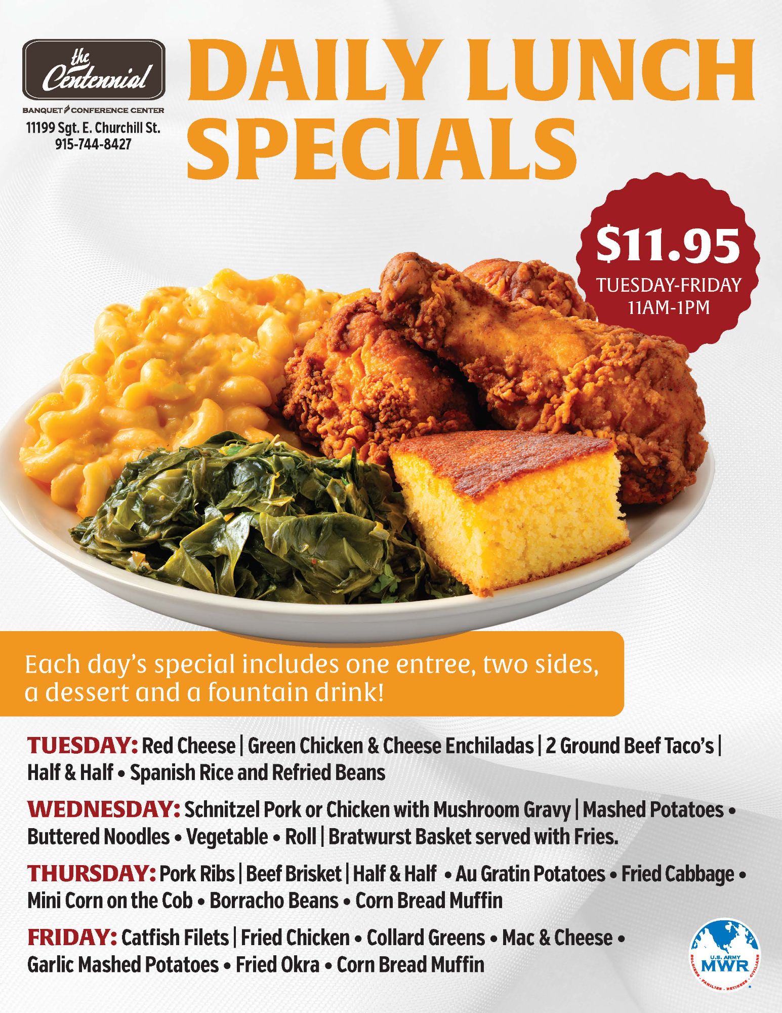 The Centennial lunch service is open Tuesday-Friday. Lunch service is CLOSED on Mondays.
