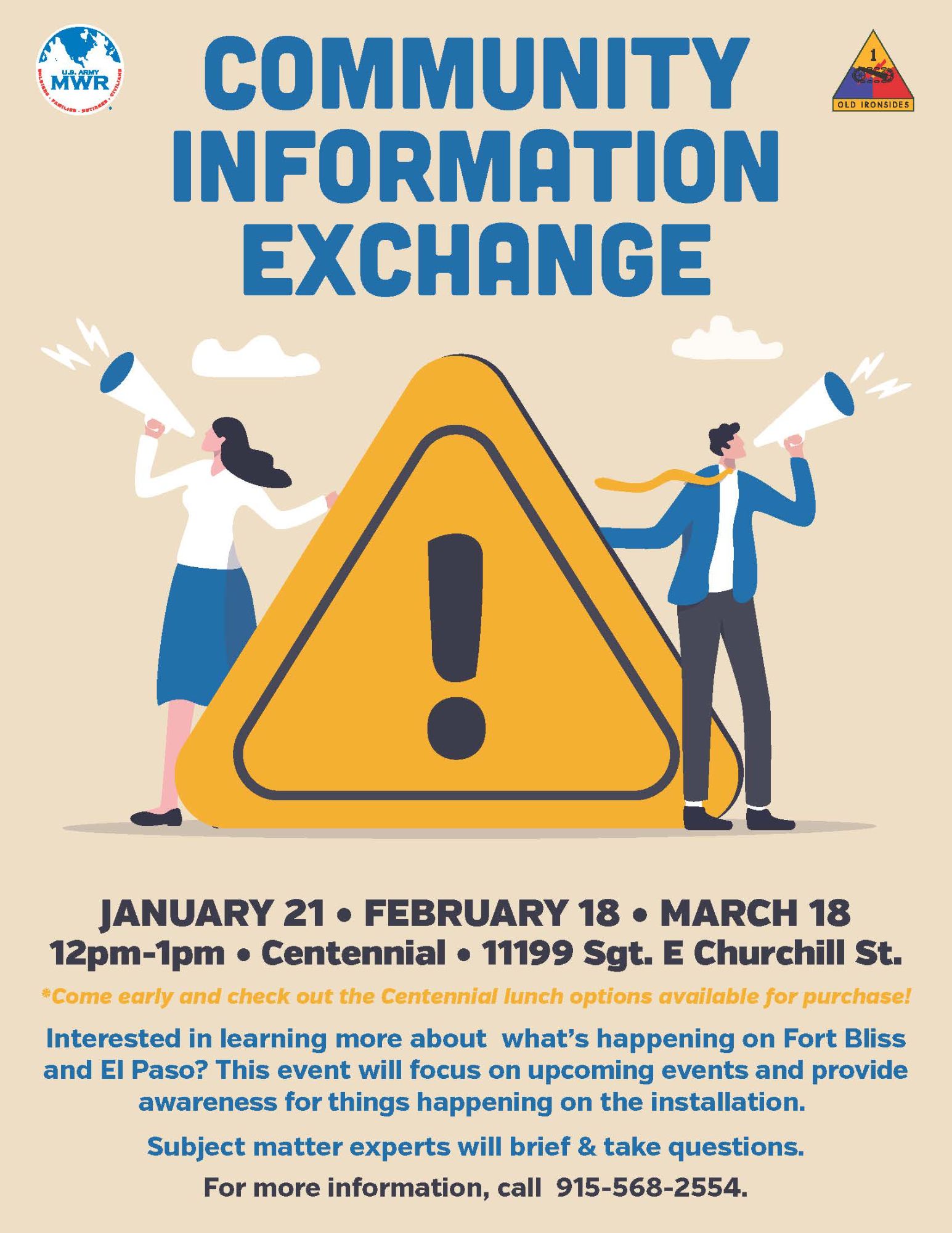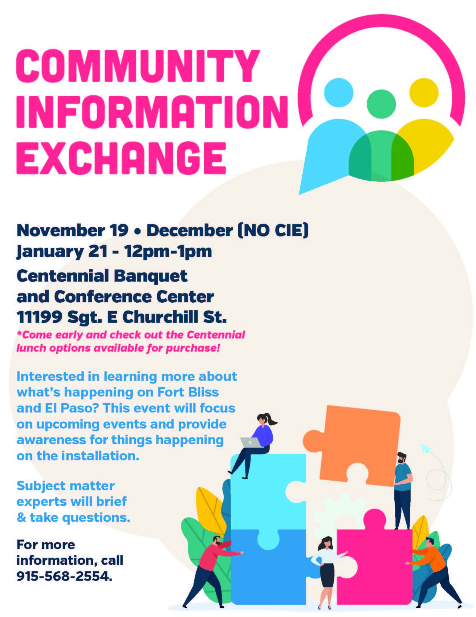 Community Information Exchange (CIE) is the newest communications initiative for the installation. This event will be held every other month on the third Wednesday at the Centennial from 12pm-1pm. A variety of briefers will discuss timely information pertaining to events, programs, installation updates and more.