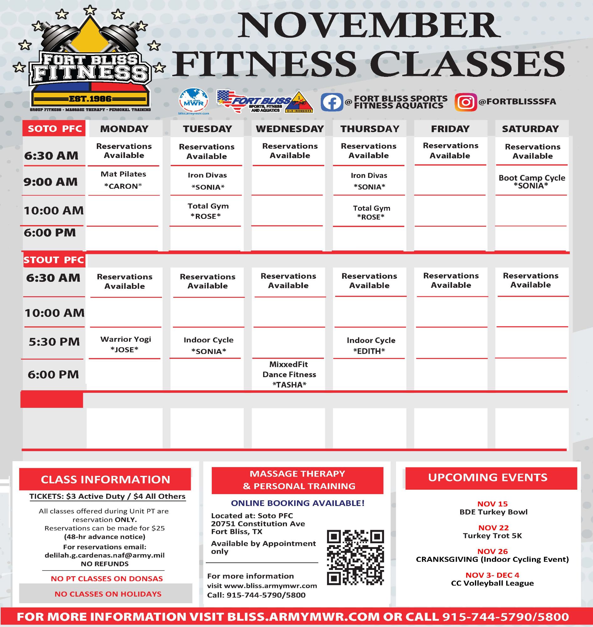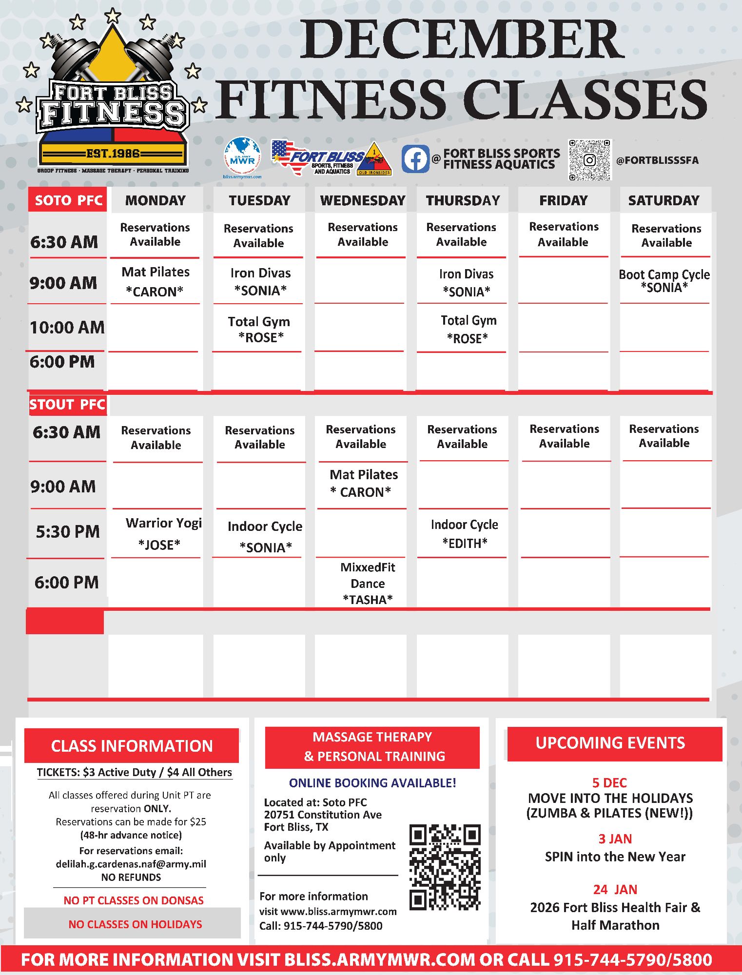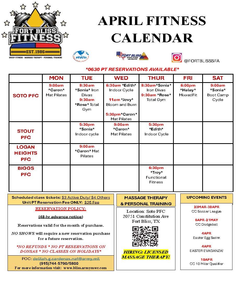 The Fort Bliss Fitness program offers a wide variety of instructional classes to meet your fitness needs. We pride ourselves on having only nationally accredited Certified instructors lead our classes, who are dedicated to maintaining their education & developing their craft. From HIIT (High Intensity Interval Training) to no/low impact water fitness to mind and body Yoga, our group fitness classes service all the demographics of people we see on Fort Bliss.