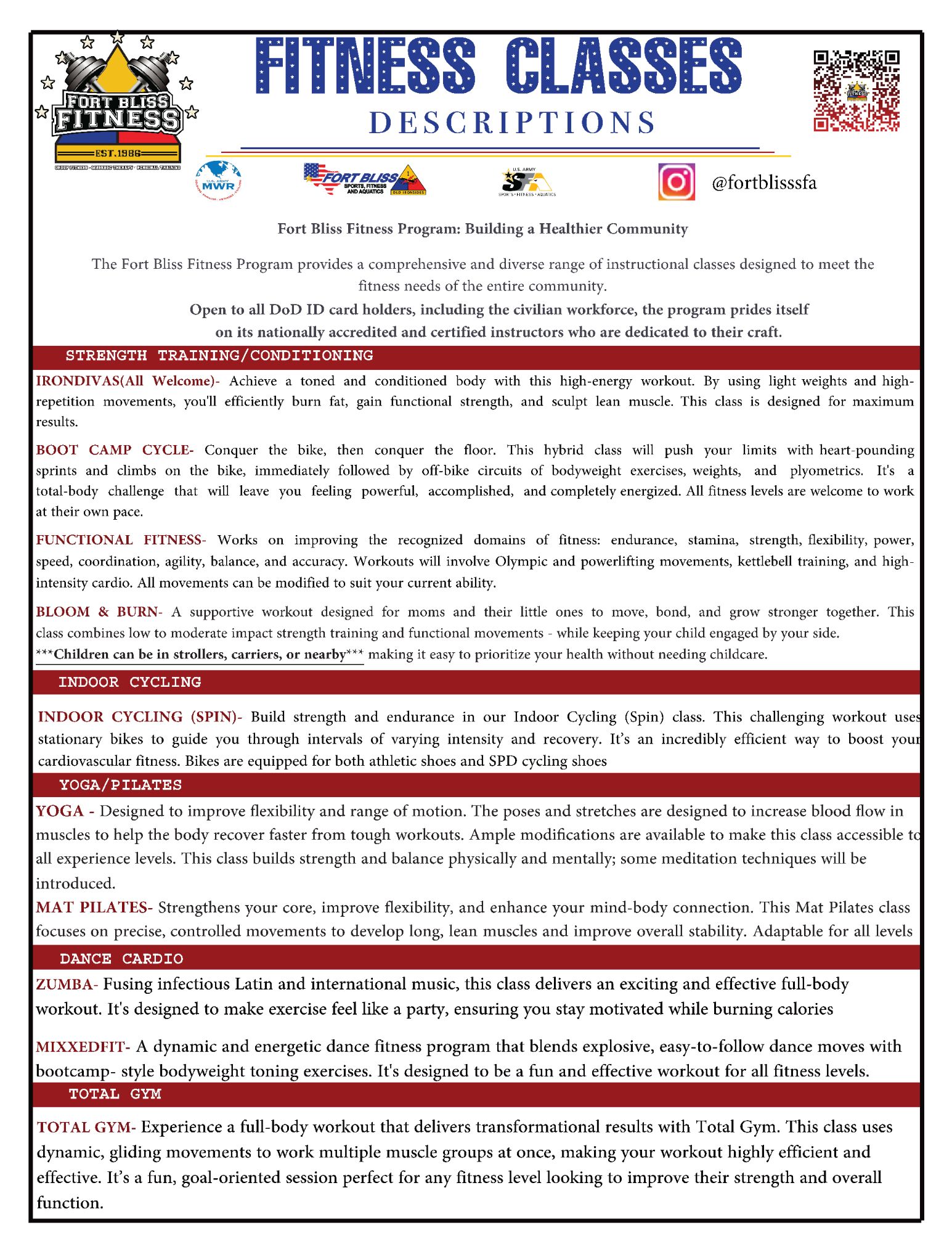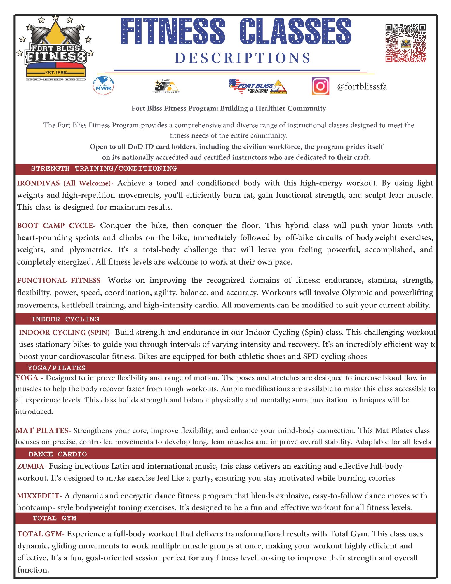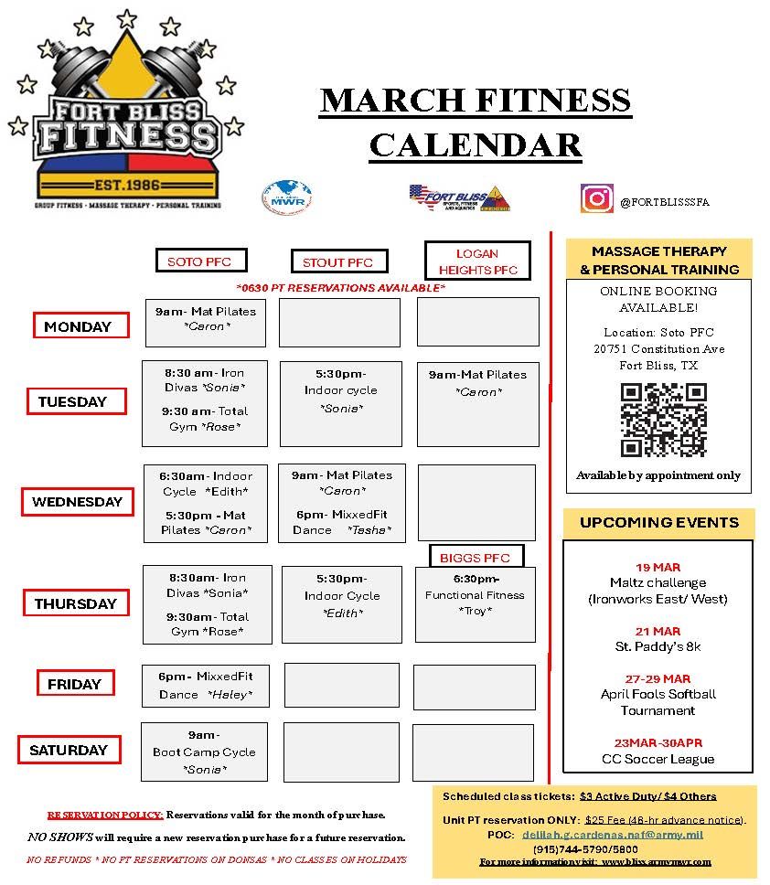 The Fort Bliss Fitness program offers a wide variety of instructional classes to meet your fitness needs. We pride ourselves on having only nationally accredited Certified instructors lead our classes, who are dedicated to maintaining their education & developing their craft. From HIIT (High Intensity Interval Training) to no/low impact water fitness to mind and body Yoga, our group fitness classes service all the demographics of people we see on Fort Bliss.