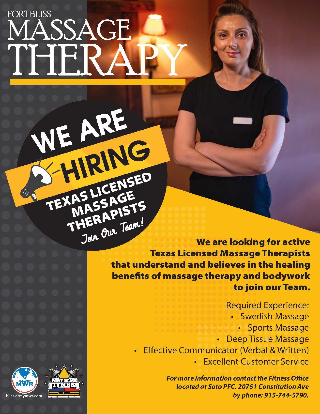 Our Massage therapist Position Is currently hiring. Please Contact 915-744-5790 For More Information!